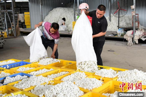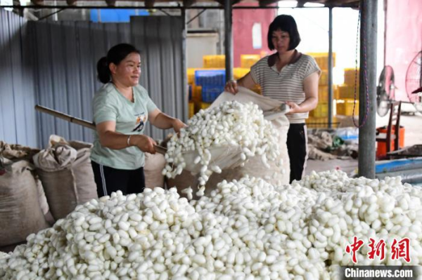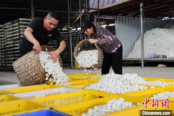 近日,廣西河池市羅城仫佬族自治縣首批春蠶繭開稱收購(gòu),當(dāng)?shù)匦Q農(nóng)們紛紛將鮮蠶繭運(yùn)送到附近收購(gòu)站銷售。目前該縣桑園種植面積達(dá)8.3萬(wàn)畝,種桑養(yǎng)蠶戶覆蓋全縣11個(gè)鄉(xiāng)鎮(zhèn)。預(yù)計(jì)全年蠶繭產(chǎn)值超8億元,2萬(wàn)多個(gè)家庭通過(guò)種桑養(yǎng)蠶實(shí)現(xiàn)增收致富。