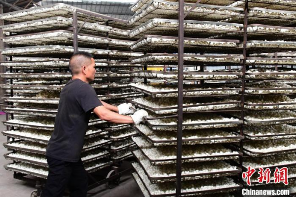 圖為工作人員將收購(gòu)的蠶繭裝盤上架,準(zhǔn)備進(jìn)爐烘烤