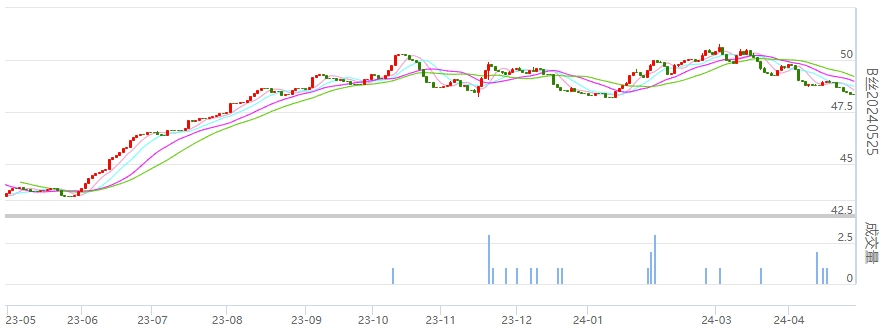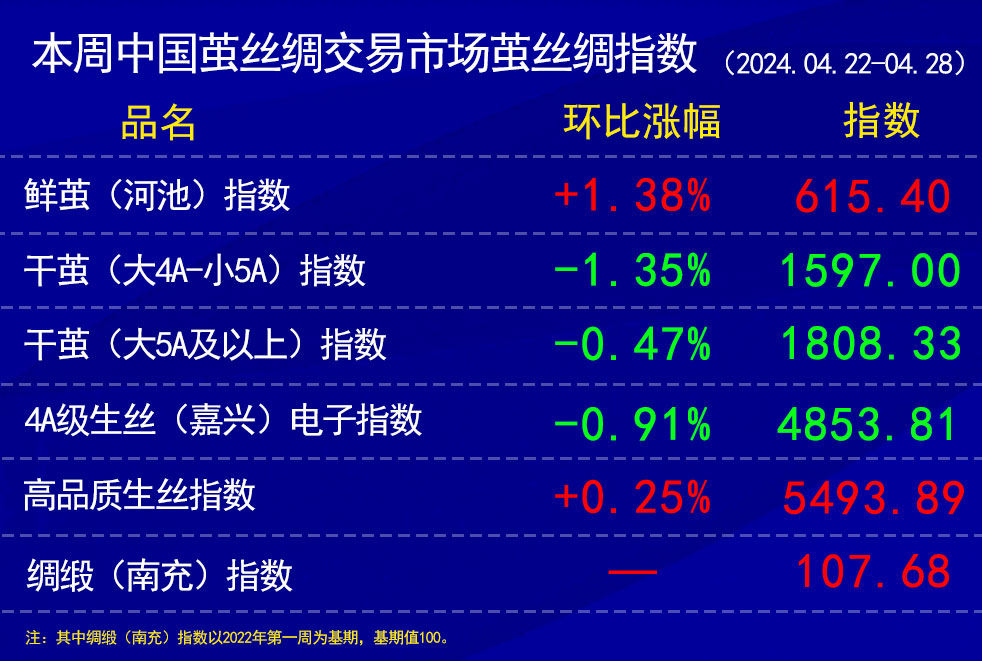 今日(2024年04月28日,周日)中國繭絲綢交易市場生絲指數(shù)微跌0.07%報(bào)于4854.17點(diǎn),本周生絲指數(shù)下跌0.91%。B絲(商檢4A級(jí)生絲):240525合約報(bào)平收于48.36萬元;240925合約下跌0.18萬元報(bào)收于48.42萬元;250325合約下跌0.03萬元報(bào)收于48.84萬元。