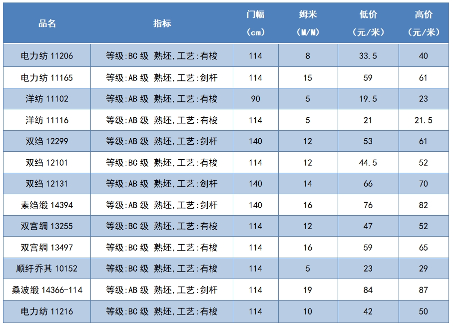 本周綢緞指數(shù)協(xié)作單位成交價(jià)格區(qū)間