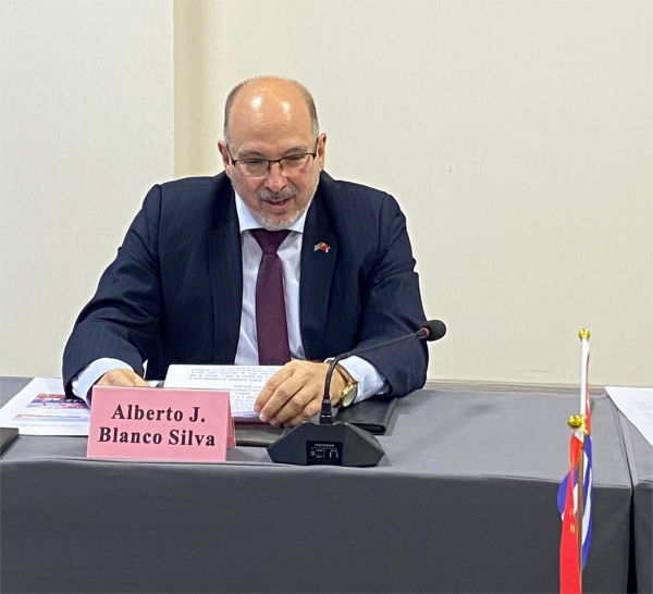 周南平對白詩德大使一行和所有參會(huì)嘉賓表示了熱烈歡迎和感謝,并介紹了學(xué)校的辦學(xué)歷史、辦學(xué)特色和取得的發(fā)展成效。他強(qiáng)調(diào),中古蠶業(yè)科技合作項(xiàng)目受到中古兩國元首的高度關(guān)注,學(xué)校一直以來非常重視項(xiàng)目的發(fā)展。他回顧了自2014年7月習(xí)近平總書記將學(xué)校培育的桑樹種子作為國禮贈(zèng)送給古巴革命領(lǐng)袖菲德爾·卡斯特羅,到2015年中國——古巴蠶??萍己献髦行脑趯W(xué)校的成立揭牌,再到2017年中古蠶桑項(xiàng)目榮獲古巴科學(xué)院國家一等獎(jiǎng),以及2023年學(xué)校舉辦中古蠶??萍己献髡搲纫幌盗欣锍瘫录?。周南平書記提出,這些合作成果已經(jīng)成為“一帶一路”倡議在拉美地區(qū)的典范和兩國友好關(guān)系的新象征,也體現(xiàn)了習(xí)近平總書記構(gòu)建人類命運(yùn)共同體理念的具體實(shí)踐。