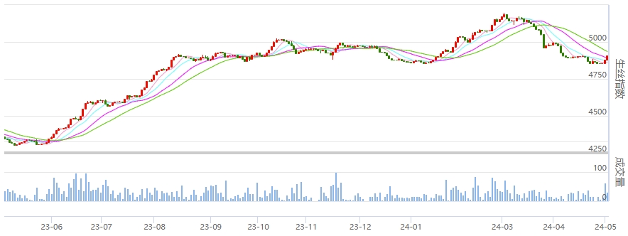 今日(2024年05月06日,周一)中國(guó)繭絲綢交易市場(chǎng)生絲指數(shù)上漲0.60%報(bào)于4910.15點(diǎn)。B絲(商檢4A級(jí)生絲):240525合約上漲0.18萬(wàn)元報(bào)收于48.84萬(wàn)元;240925合約上漲0.15萬(wàn)元報(bào)收于49.17萬(wàn)元;250325合約上漲0.30萬(wàn)元報(bào)收于49.44萬(wàn)元。