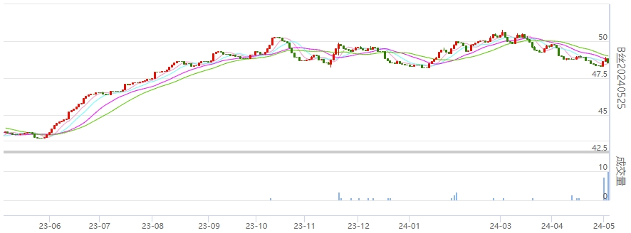 今日(周二)盤面多數(shù)收綠,現(xiàn)貨月240525生絲合約今日增倉,價(jià)格有所收跌。同樣,活躍月份240925和250325生絲合約今日也有所增倉收綠。