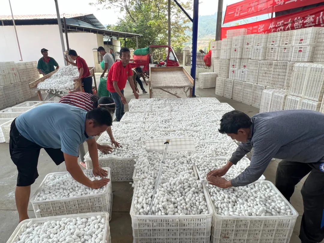 在云南隴川,當(dāng)?shù)氐牡诙豪O正在上市。多年來,德宏正信實(shí)業(yè)股份有限公司從種桑、養(yǎng)蠶到蠶繭收購各環(huán)節(jié)與農(nóng)戶建立緊密的利益聯(lián)結(jié)機(jī)制,采取“龍頭企業(yè)+專業(yè)化小蠶共育基地+農(nóng)戶”的生產(chǎn)組織模式和“科技特派員+公司技術(shù)人員+農(nóng)村經(jīng)濟(jì)合作組織+科技示范戶+輻射帶動(dòng)戶”的科技示范推廣模式,把養(yǎng)蠶環(huán)節(jié)中技術(shù)要求高、養(yǎng)殖難度大的工作由企業(yè)承擔(dān),讓蠶農(nóng)輕松養(yǎng)蠶、放心養(yǎng)蠶,還不斷延伸產(chǎn)業(yè)鏈條,切實(shí)帶動(dòng)當(dāng)?shù)禺a(chǎn)業(yè)發(fā)展。
