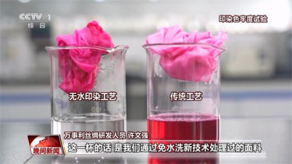 “大家可以看到的就是這個是我們傳統(tǒng)的,它跟纖維的結合能力比較差,所以它殘留了非常多的顏色。這一杯是我們通過免水洗新技術處理過的面料,你可以看到它的杯底,基本都是已經(jīng)沒有顏色的了,它是相當于我們的活性染料和我們的面料纖維已經(jīng)達到了100%的結合。”許文強說。