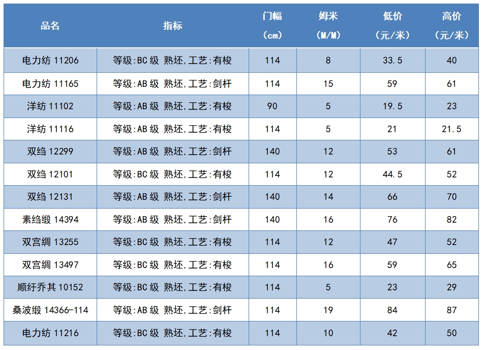 本周綢緞指數(shù)協(xié)作單位成交價格區(qū)間