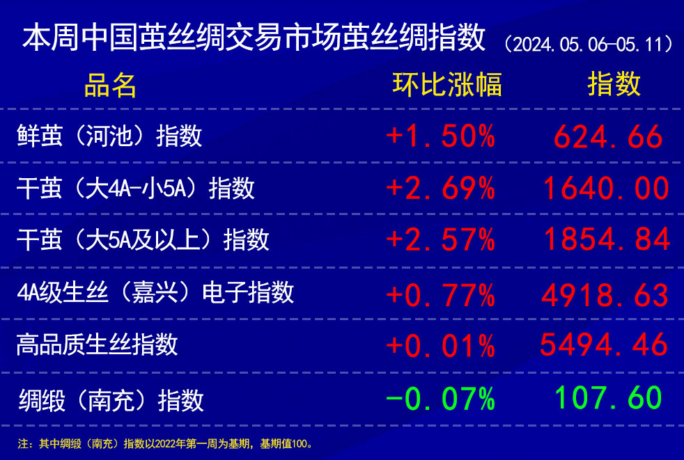 上周時間段多為五一假期,也是為廣西宜州等地的第二批春繭上市時間段,本周協(xié)作單位所報的鮮繭價格等指教等也包括了上周。整體上,收購價格持高,同時五一后廣西等地大范圍降雨,一定程度上影響鮮繭指標。根據(jù)協(xié)作單位所報轉換后,鮮繭指數(shù)上漲1.5%報于624.66點。
