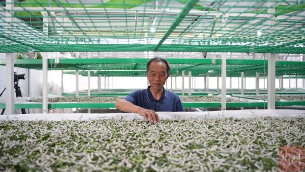 5月10日,在宜賓高縣嘉樂(lè)鎮(zhèn)人民村的現(xiàn)代化大蠶養(yǎng)殖工廠,整齊擺放著多層自動(dòng)化升降蠶架,數(shù)十萬(wàn)個(gè)“蠶寶寶”正睡得津津有味,村里的養(yǎng)蠶能手王付章穿梭在蠶架間查看它們的睡眠情況?!斑@批蠶再過(guò)一個(gè)周就可以上蔟結(jié)繭了。”