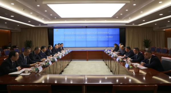 周勇對胡賽諾夫大使一行的來訪表示歡迎,并介紹了蘇豪控股集團的基本情況以及與阿塞拜疆的交流合作情況。他表示,阿塞拜疆是連接歐亞的橋梁,資源豐富、區(qū)位優(yōu)越。江蘇與阿塞拜疆經(jīng)貿(mào)合作交往密切,貿(mào)易總量逐年大幅提升。蘇豪控股集團高度重視阿塞拜疆市場拓展,不斷擴大設(shè)備出口規(guī)模,增強桑蠶絲綢領(lǐng)域業(yè)務(wù)對接和技術(shù)合作,雙方貿(mào)易往來更加頻繁,交流合作成果豐碩??缋锖H運輸走廊建設(shè)取得重要進展,今年2月成功開行南京至阿塞拜疆首都巴庫的跨里海班列,進一步豐富了江蘇班列多元通道發(fā)展的布局,加強了江蘇與阿塞拜疆的互聯(lián)互通。展望未來,雙方合作空間廣闊,前景令人期待,油氣產(chǎn)業(yè)是阿塞拜疆的重要支柱產(chǎn)業(yè),與蘇豪控股集團大力發(fā)展的大宗商品及能源業(yè)務(wù)高度契合,希望雙方加強原油進口方面的業(yè)務(wù)交流,探索務(wù)實合作的可行路徑。