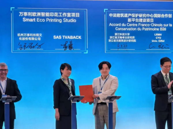 當地時間5月13日下午,由浙江省政府主辦的浙江—法國高新產業(yè)創(chuàng)新合作對接會在法國巴黎舉行,杭州萬事利絲綢文化股份有限公司與法國企業(yè)SAS TVABACK就“萬事利歐洲智能印花工作室項目”(Smart Eco Printing Studio)達成合作。省委書記、省人大常委會主任易煉紅在會上致辭并見證一系列項目簽約。