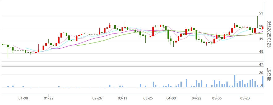 今日(2024年05月29日,周三)中國繭絲綢交易市場生絲指數上漲0.48%報于4950.46點。B絲(商檢4A級生絲):240625合約上漲0.27萬元報收于49.11萬元;240925合約上漲0.21萬元報收于49.47萬元;250325合約上漲0.18萬元報收于50.10萬元。