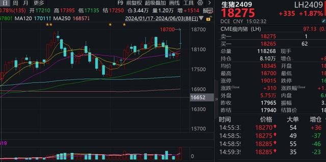 在期市大片走弱的環(huán)境下,生豬期貨一枝獨(dú)秀,6月3日一度收獲超2%漲幅。消息面上,隨著端午節(jié)臨近,近期生豬市場(chǎng)價(jià)格持續(xù)大幅走強(qiáng)。加之經(jīng)歷前期持續(xù)虧損,當(dāng)前生豬養(yǎng)殖端整體步入盈利區(qū)間,周期反轉(zhuǎn)預(yù)期確立,生豬期貨近期持續(xù)震蕩走強(qiáng)。