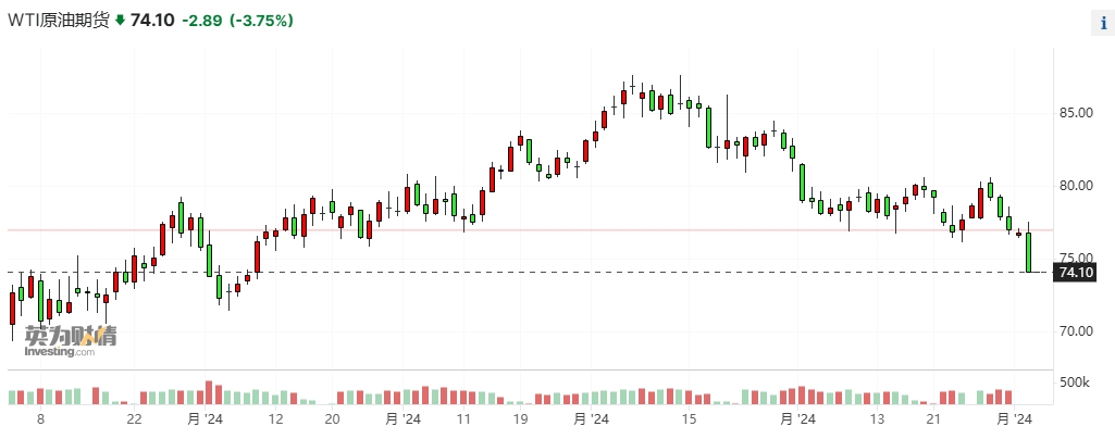 具體行情顯示,截至發(fā)稿,紐約商品交易所WTI原油(576, -24.10, -4.02%)期貨跌超3.7%報每桶74.10美元,日內(nèi)一度跌破74美元,為2月初以來的首次;布倫特原油期貨也跌近3.5%,報每桶78.28美元,為近四個月來的最低水平。