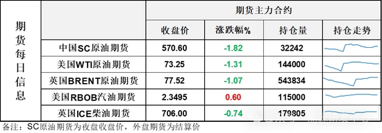 【1】WTI主力原油期貨收跌0.97美元,跌幅1.31%,報(bào)73.25美元/桶;布倫特主力原油期貨收跌0.84美元,跌幅1.07%,報(bào)77.52美元/桶;INE原油期貨收跌1.82%,報(bào)570.6元。