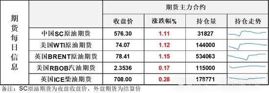 【1】WTI主力原油期貨收漲0.82美元,漲幅1.12%,報74.07美元/桶;布倫特主力原油期貨收漲0.89美元,漲幅1.15%,報78.41美元/桶;INE原油期貨收漲1.11%,報576.3元。