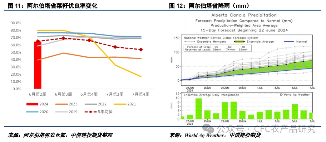 目前加菜籽主產(chǎn)區(qū)播種已經(jīng)基本結(jié)束,市場關(guān)注點轉(zhuǎn)向優(yōu)良率及天氣變化。從阿爾伯塔省歷年菜籽優(yōu)良率的變化趨勢來看,7月發(fā)布的優(yōu)良率報告整體呈現(xiàn)下降趨勢,但下降幅度受制于當(dāng)時的天氣表現(xiàn)。近期阿爾伯塔省降雨持續(xù)偏多,使得短期內(nèi)優(yōu)良率下調(diào)概率較低。
