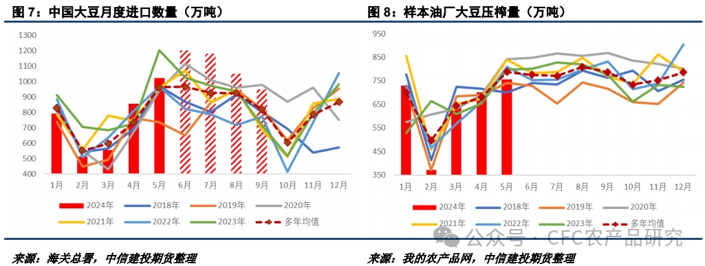 從中國預(yù)計進口情況來看,目前9月存在一定缺口,但6-8月份大豆到港整體偏寬松運行。從油廠的開機率和壓榨數(shù)量來看,近端大豆及豆油(7872, 14.00, 0.18%)的消化壓力仍然較大。預(yù)計7-9月大豆進口數(shù)分別為1180/1050/950萬噸。