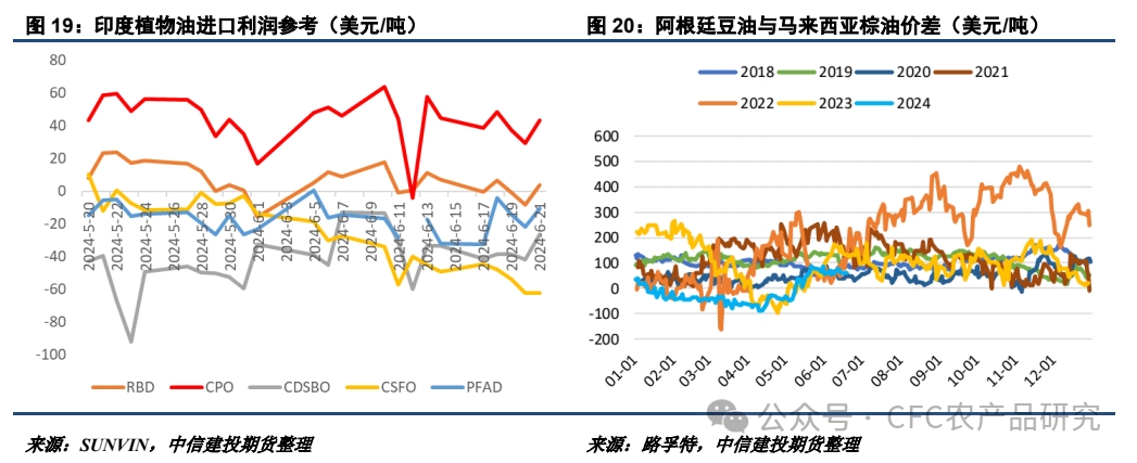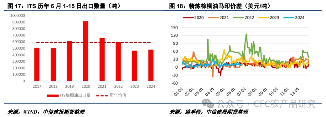相較于大豆和菜籽的弱勢表現(xiàn),BMD馬棕表現(xiàn)相對偏強。盡管6月1-20日出口高頻數(shù)據(jù)顯示馬棕出口環(huán)比走弱,但馬來西亞庫存離200萬噸尚有一定距離,產(chǎn)地壓力暫未得到明顯體現(xiàn)。目前馬印價差處于中性偏低區(qū)間,印尼性價比有限。