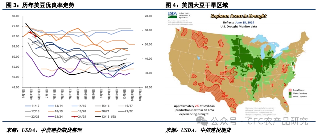 截至6月18日,美豆十一大主產(chǎn)州加權(quán)平均土壤干旱比例為3.16%,同比下降55.23個百分點。另外優(yōu)良率周度環(huán)比下調(diào)2個百分點至70%,其中伊利諾伊州下調(diào)5個百分點以上,但整體仍高于去年同期的54%。目前來看優(yōu)良率仍保持較高水平,但7-8月仍為美豆單產(chǎn)博弈的關(guān)鍵階段,從歷史情況來看優(yōu)良率仍易減難增。