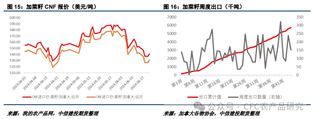 本周加菜籽CNF報價維持震蕩,國內(nèi)買船積極性暫時下降,目前6-10月份菜籽買船基本充足。加菜籽累計出口數(shù)量已超過570萬噸,預(yù)計能夠完成600萬噸的出口目標(biāo),但整體結(jié)轉(zhuǎn)庫存增加趨勢已經(jīng)在所難免。