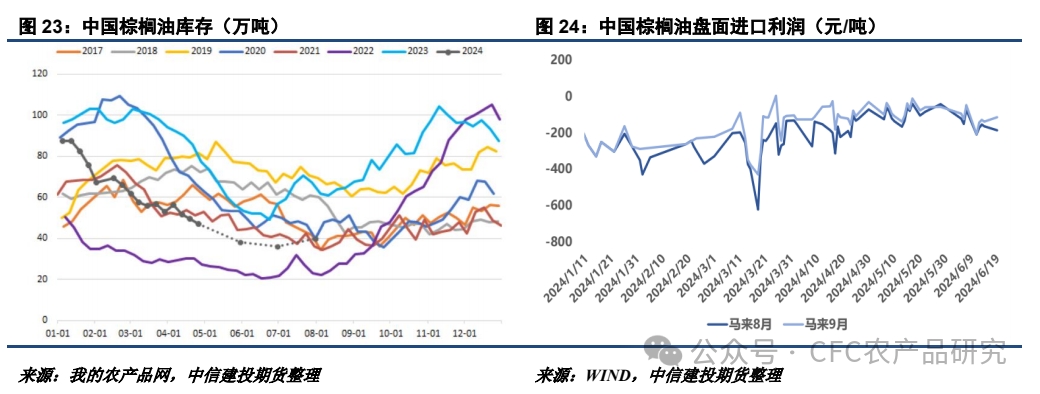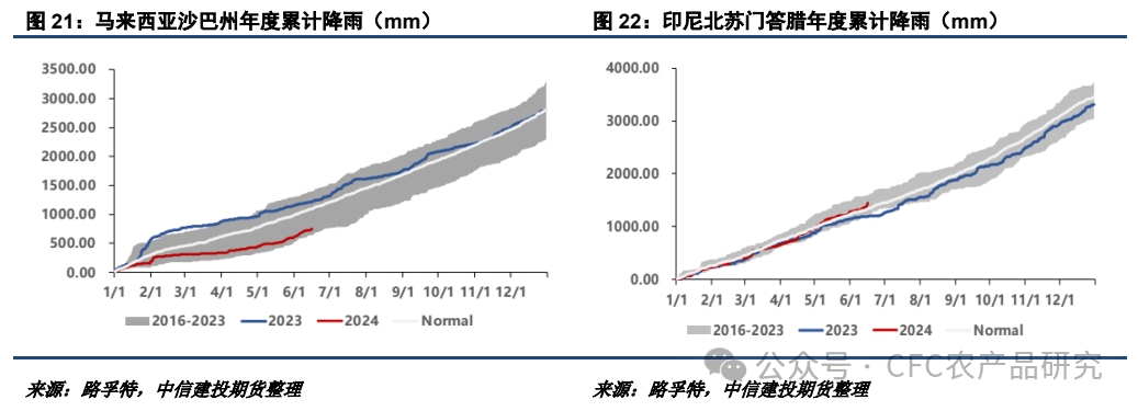 目前棕櫚油產(chǎn)地天氣表現(xiàn)整體較好,但部分地區(qū)出現(xiàn)一定的偏干跡象。馬來西亞沙巴州的累計降雨持續(xù)偏低,且明顯弱于2023年。5月份沙巴州產(chǎn)量就明顯弱于其他產(chǎn)區(qū),若后期沙巴州產(chǎn)量偏低,可能拖累馬來整體的季節(jié)性增產(chǎn)勢頭。另外,印尼蘇門答臘地區(qū)的降雨整體較為正常,暫未出現(xiàn)明顯的減產(chǎn)勢頭,23年8-10月產(chǎn)地厄爾尼諾現(xiàn)象題材短期內(nèi)發(fā)酵的概率偏低。
