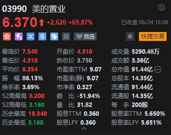 內(nèi)房股個(gè)別強(qiáng)勢,美的置業(yè)大漲近70%。美的系擬進(jìn)行重組計(jì)劃。美的置業(yè)公布,擬將剝離房地產(chǎn)開發(fā)業(yè)務(wù),改由不上市的美的建業(yè)(私人公司)持有,股東可選擇收取1股美的建業(yè)股份,或收取現(xiàn)金5.9港元,較上個(gè)交易日(21日)收市價(jià)溢價(jià)57.3%。