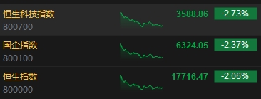 6月27日消息,港股三大指數(shù)低開低走,截至收盤,恒生指數(shù)(17716.471, -373.46, -2.06%)跌2.06%,報(bào)17716.47點(diǎn),恒生科技指數(shù)(3588.86, -100.82, -2.73%)跌2.73%,國企指數(shù)跌2.37%。盤面上,科網(wǎng)股普遍下挫,小米集團(tuán)全天重挫逾7%,美團(tuán)跌近3%,京東跌超2%,騰訊、阿里巴巴、聯(lián)想跌近2%;煤炭股跌幅居前,中國神華(35.15, -2.06, -5.53%)跌超5%;家電股全天低迷,海信家電(28.15, -3.25, -10.35%)跌超10%;醫(yī)藥股齊挫,微創(chuàng)機(jī)器人跌超18%;電訊服務(wù)板塊逆勢高漲,中國電信(4.65, 0.13, 2.88%)漲近3%。