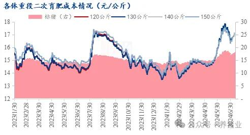 2024年上半年,二育大致分為兩波。第一批在今年的3月初-4月中旬,由于毛豬價格位于低位,二育進場成本較低,疊加供應縮減市場看漲情緒一度被點燃。據(jù)Mysteel農(nóng)產(chǎn)品數(shù)據(jù)監(jiān)測顯示3月初-4月中旬入100公斤二次育肥,養(yǎng)至120公斤,平均成本在14.73元/公斤;養(yǎng)至130公斤,平均成本在14.61元/公斤;養(yǎng)至140公斤,平均成本在14.61元/公斤;養(yǎng)至150公斤,平均成本在14.74元/公斤。