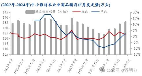 進入6月規(guī)模場商品豬存欄量為3384.09萬頭,環(huán)比上漲0.41%,同比減少0.41%。85家中小散樣本企業(yè)6月份存欄量為135.71萬頭,環(huán)比上漲1.59%,同比上漲2.35%。2023年7月仍有慣性投苗補欄,對應2024年6月生豬供給增加,且5月份看漲預期下,養(yǎng)殖端有壓欄操作,出欄節(jié)奏減緩,亦不乏散養(yǎng)戶二育及仔豬和母豬投苗,故商品豬存欄量環(huán)比增量。隨著一季度仔豬及其母豬的補欄產(chǎn)能兌現(xiàn),預計三四季度商品豬存欄量是微增趨勢。