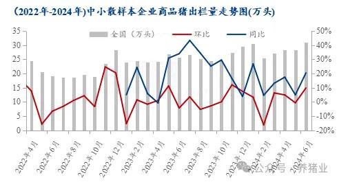 2024年上半年商品豬出欄量變化較明顯,1-2月份因去年12月養(yǎng)殖企業(yè)年底集中出欄,出欄量較高,而造成1-2月份出欄量較少。3-4月份出欄量較為平均,5月份因前期壓欄豬源及部分二次育肥豬源出欄,增量明顯。6月份規(guī)模樣本企業(yè)出欄進度不快,部分未完成,環(huán)比減少7.65%。散戶樣本企業(yè)價格下行態(tài)勢下加大出欄量,環(huán)比增加9.76%。
