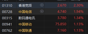 電訊服務(wù)板塊漲勢活躍,中國電信漲近2%。消息面上,摩根大通研報指出,重申對內(nèi)地三大電信股“增持”評級。該行看好中移動收益率達7%及股息年均復(fù)合增長率達7%;在波動市場中的防御性高;相對于中電信及聯(lián)通,中移動股價跑輸,具追落后潛力。該行預(yù)期內(nèi)地電信股第二季收入疲弱但盈利穩(wěn)健。