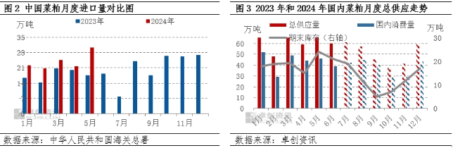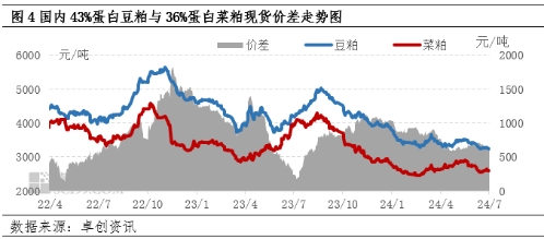 從進(jìn)口和庫存數(shù)據(jù)分析來看,進(jìn)口菜粕增量明顯,2024年1-5月份,我國共進(jìn)口菜粕119.31萬噸,較去年同期的88.49萬噸增加34.83%;庫存數(shù)據(jù)仍處于歷年的偏高水平,至7月12日,沿海壓榨企業(yè)菜籽庫存在37.2萬噸,菜粕庫存3.95萬噸,港口進(jìn)口菜粕庫存接近20萬噸。
