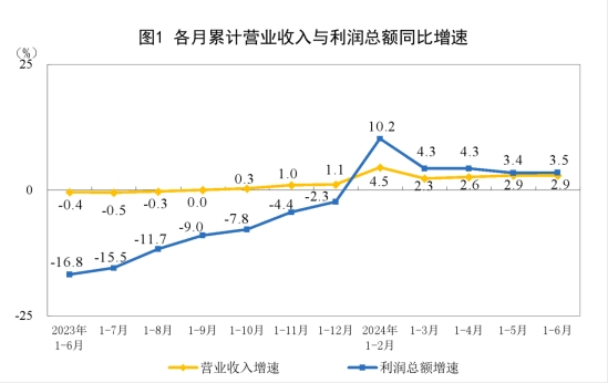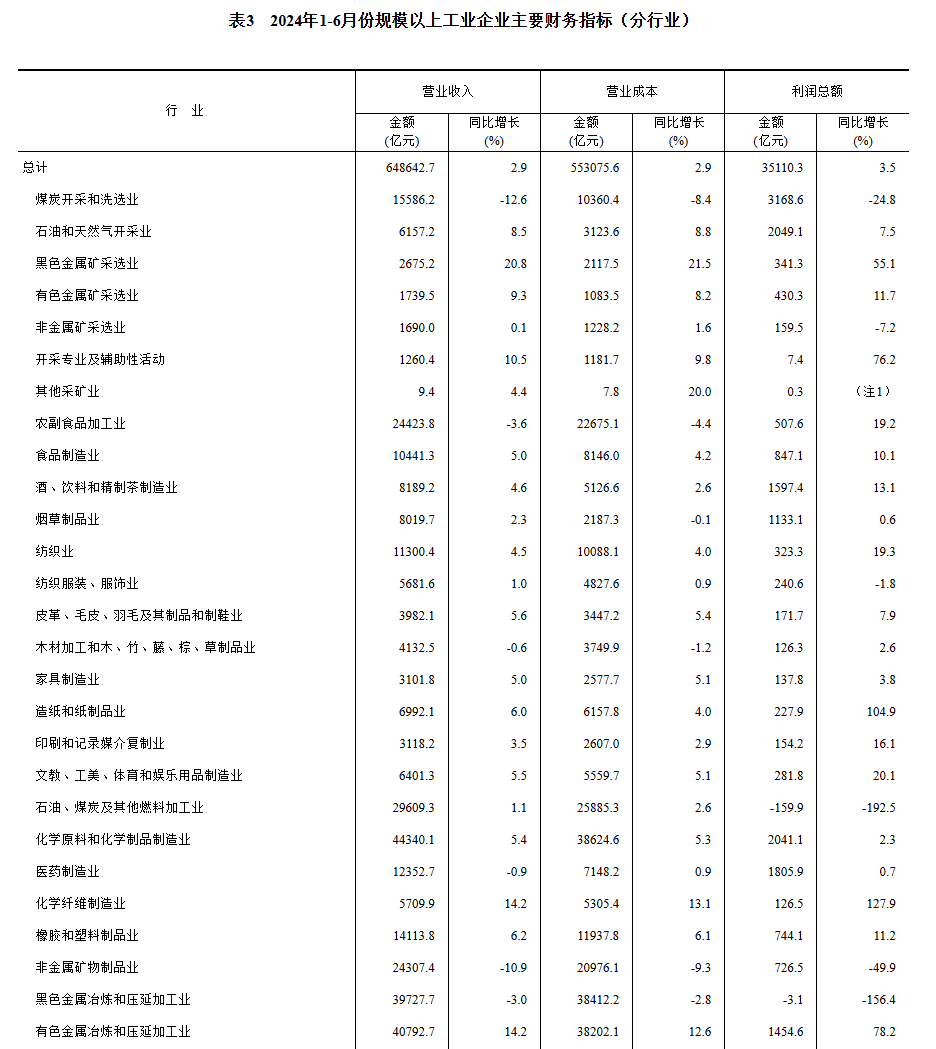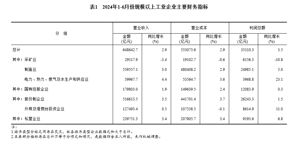 1—6月份,全國規(guī)模以上工業(yè)企業(yè)實(shí)現(xiàn)利潤總額35110.3億元,同比增長3.5%(按可比口徑計算,詳見附注二)。