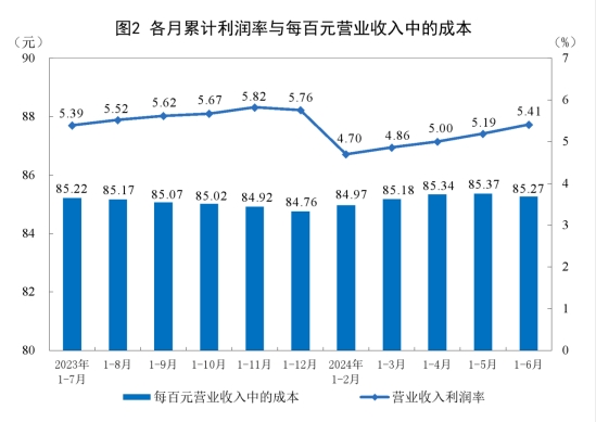 1—6月份,規(guī)模以上工業(yè)企業(yè)每百元營業(yè)收入中的成本為85.27元,同比增加0.02元;每百元營業(yè)收入中的費(fèi)用為8.43元,同比增加0.05元。