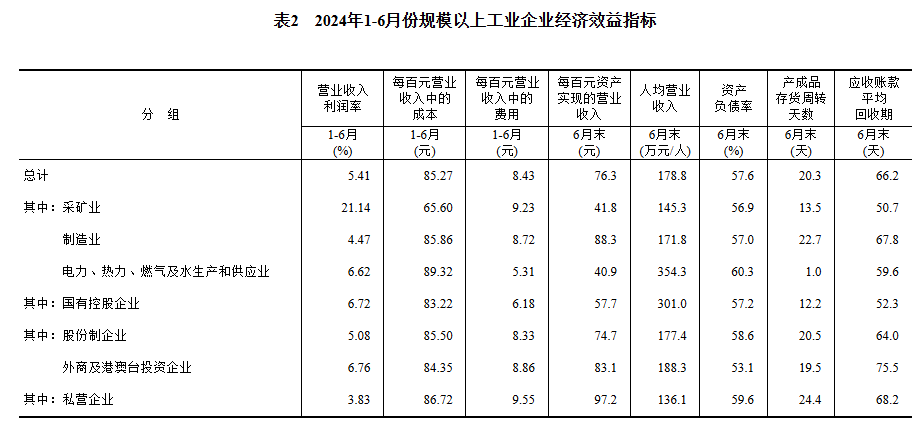 1—6月份,規(guī)模以上工業(yè)企業(yè)實(shí)現(xiàn)營業(yè)收入64.86萬億元,同比增長2.9%;發(fā)生營業(yè)成本55.31萬億元,增長2.9%;營業(yè)收入利潤率為5.41%,同比提高0.03個百分點(diǎn)。