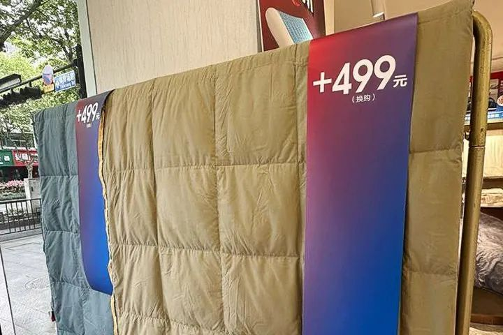 在水星家紡各門店,“以舊換新”、“舊物當(dāng)錢花”、“總部補(bǔ)貼以舊換新”,等等的宣傳標(biāo)語非常醒目,幾乎所有的產(chǎn)品都參與以舊換新活動(dòng)。