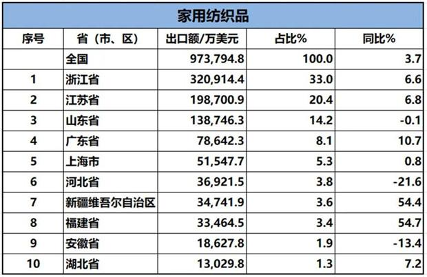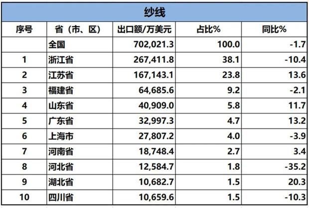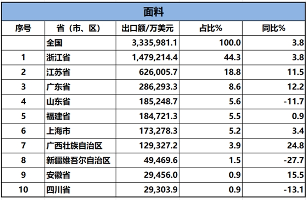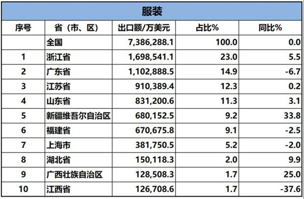 2024年1-6月,我國紡織服裝累計出口1432.38億美元,同比增長1.6%。內地31個省、自治區(qū)、直轄市紡織服裝統(tǒng)計數據已出爐,浙江省、江蘇省、廣東省、山東省、福建省分別列全國紡織服裝出口省市前五位,合計比重超七成。