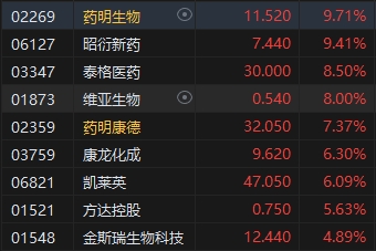 醫(yī)藥外包概念股全天漲幅居前,藥明生物漲近10%。消息面上,近期,多家CRO頭部企業(yè)發(fā)布2024年上半年業(yè)績預(yù)告,釋放出行業(yè)復(fù)蘇信號(hào)。其中,藥明康德(32.05, 2.20, 7.37%)上半年收入約172.41億元,同比減少8.6%;母公司持有者應(yīng)占溢利約42.4億元,同比減少20.2%。截至2024年6月末,公司在手訂單為431 億元?jiǎng)?chuàng)新高。此外,凱萊英(47.05, 2.70, 6.09%)和康龍化成(9.62, 0.57, 6.30%)同樣給出了超預(yù)期的訂單增長數(shù)據(jù)。其中,康龍化成上半年新簽訂單金額同比增長15%以上;凱萊英新簽訂單則同比增長超過20%。