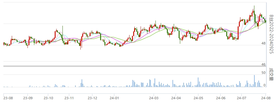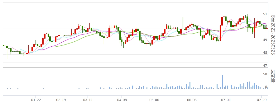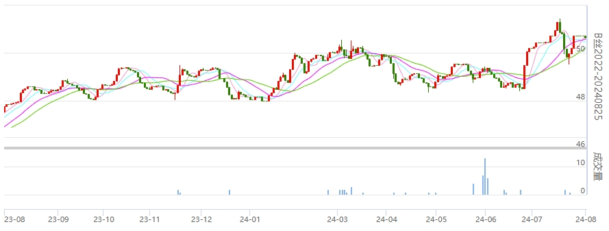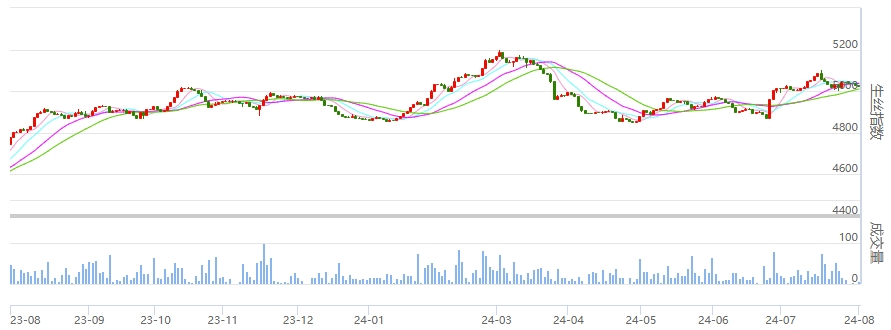今日(2024年08月01日,周四)中國(guó)繭絲綢交易市場(chǎng)生絲電子指數(shù)微跌0.10%報(bào)5026.81點(diǎn)。B絲2022D(商檢4A級(jí)生絲):240825合約下跌0.09萬(wàn)元報(bào)收于50.64萬(wàn)元;240925合約下跌0.18萬(wàn)元報(bào)收于50.16萬(wàn)元;250325合約上漲0.06萬(wàn)元報(bào)收于50.04萬(wàn)元。