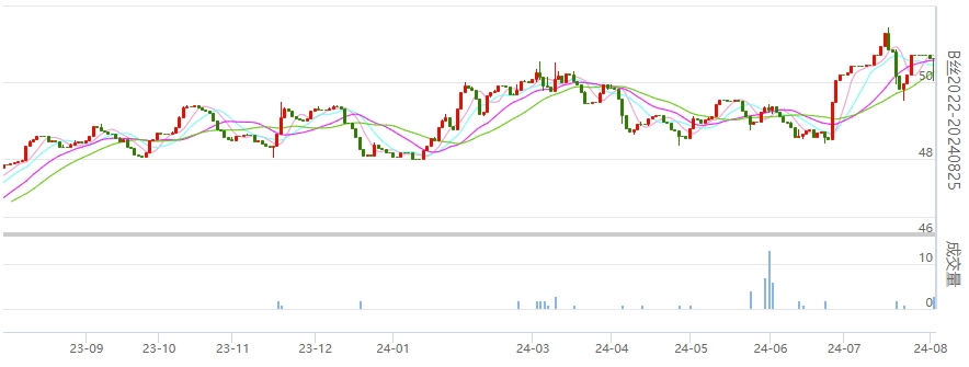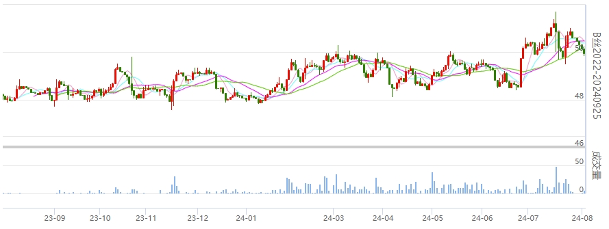 今日(2024年08月02日,周五)中國繭絲綢交易市場生絲電子指數(shù)下跌0.19%報(bào)5017.38點(diǎn),本周生絲指數(shù)下跌0.49%。B絲2022D(商檢4A級(jí)生絲):240825合約報(bào)平收于50.64萬元;240925合約下跌0.21萬元報(bào)收于49.95萬元;250325合約下跌0.21萬元報(bào)收于49.83萬元。