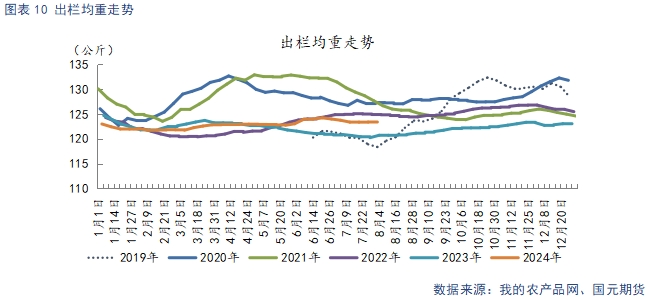 截止8月2日,生豬出欄均重123.4公斤,與上月環(huán)比上調0.02公斤??礉q情緒下,養(yǎng)殖端壓欄、二育增多。大豬供應偏緊,標肥價差倒掛,前期壓欄、二育的大體重豬出欄積極性較強,出欄均重預期延續(xù)小幅上調。