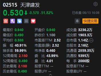 天津建發(fā)暴跌近52%。該股昨日亦大幅下跌近20%。今年4月,天津建發(fā)登陸港股市場(chǎng),上市當(dāng)日即破發(fā),如今股價(jià)已跌去近八成,市值僅余 億港元,距離淪為仙股只有一步之遙。天津建發(fā)此前發(fā)布盈警,預(yù)期截至2024年6月30日止六個(gè)月純利不少于人民幣1000萬(wàn)元,較去年同期減少約46.2%。