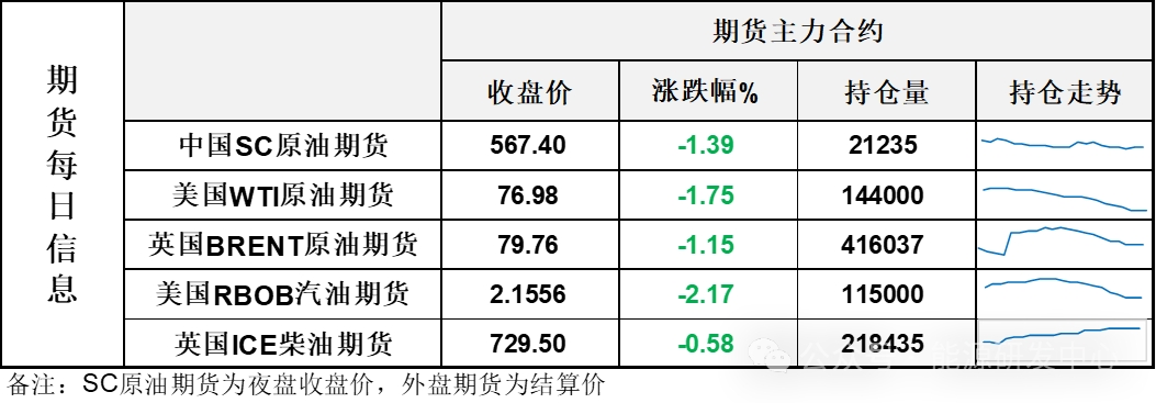 【1】WTI主力原油期貨收跌1.37美元,跌幅1.75%,報76.98美元/桶;布倫特主力原油期貨收跌0.93美元,跌幅1.15%,報79.76美元/桶;INE原油期貨收跌1.39%,報567.4元。