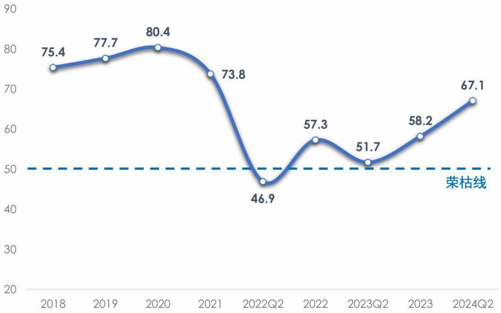 2024年上半年,外部環(huán)境復雜性嚴峻性不確定性明顯上升、國內(nèi)結(jié)構(gòu)調(diào)整持續(xù)深化等帶來新挑戰(zhàn),但宏觀政策效應持續(xù)釋放、外需有所回暖、新質(zhì)生產(chǎn)力加速發(fā)展等因素也形成新支撐。我國產(chǎn)業(yè)用紡織品行業(yè)的市場需求總體回暖,新冠肺炎疫情帶來的需求大幅波動的影響已經(jīng)基本消退,行業(yè)工業(yè)增加值增速自2023年年初以來重回上升通道,但部分應用領(lǐng)域需求的不確定性和各類潛在風險影響著行業(yè)當前的發(fā)展和對未來的預期。根據(jù)協(xié)會調(diào)研,2024年上半年我國產(chǎn)業(yè)用紡織品行業(yè)景氣指數(shù)為67.1,較2023年同期(51.7)顯著回升(圖1)。