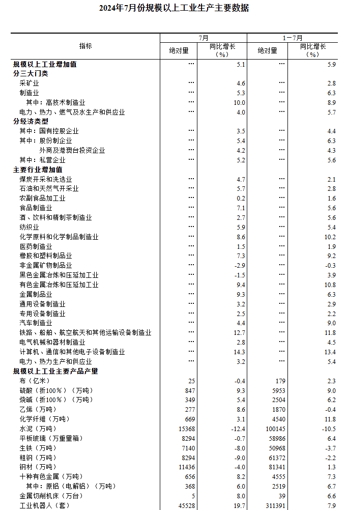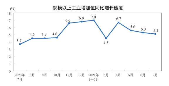 7月份,規(guī)模以上工業(yè)增加值同比實際增長5.1%(增加值增速均為扣除價格因素的實際增長率)。從環(huán)比看,7月份,規(guī)模以上工業(yè)增加值比上月增長0.35%。1—7月份,規(guī)模以上工業(yè)增加值同比增長5.9%。
