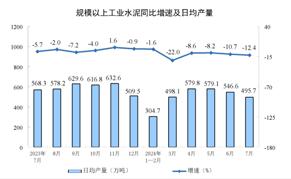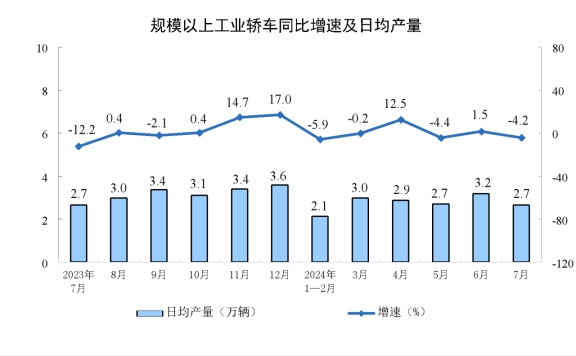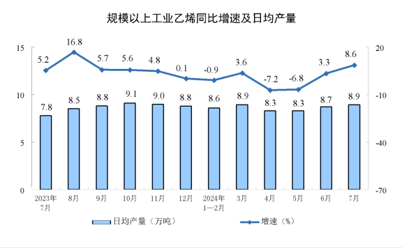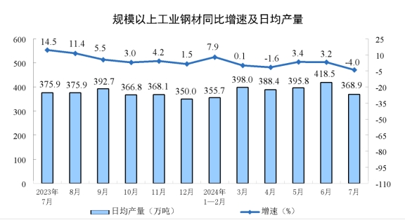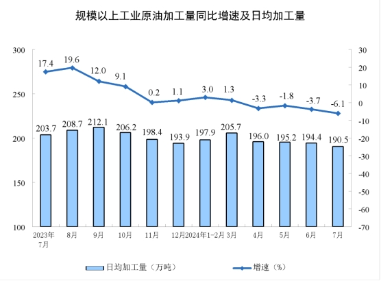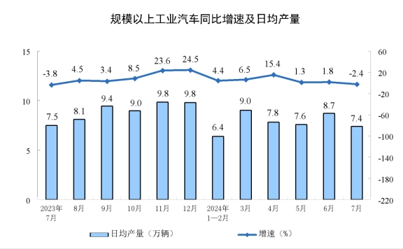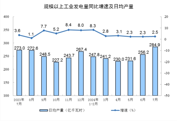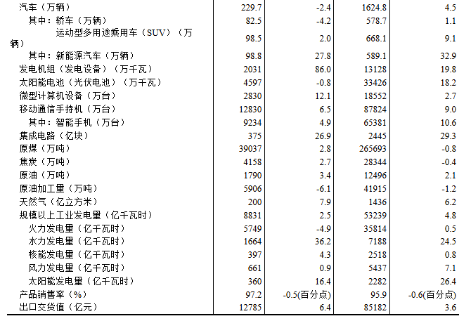 分產(chǎn)品看,7月份,規(guī)模以上工業(yè)619種產(chǎn)品中有367種產(chǎn)品產(chǎn)量同比增長。其中,鋼材11436萬噸,同比下降4.0%;水泥15368萬噸,下降12.4%;十種有色金屬656萬噸,增長8.2%;乙烯277萬噸,增長8.6%;汽車229.7萬輛,下降2.4%,其中新能源汽車98.8萬輛,增長27.8%;發(fā)電量8831億千瓦時,增長2.5%;原油加工量5906萬噸,下降6.1%。
