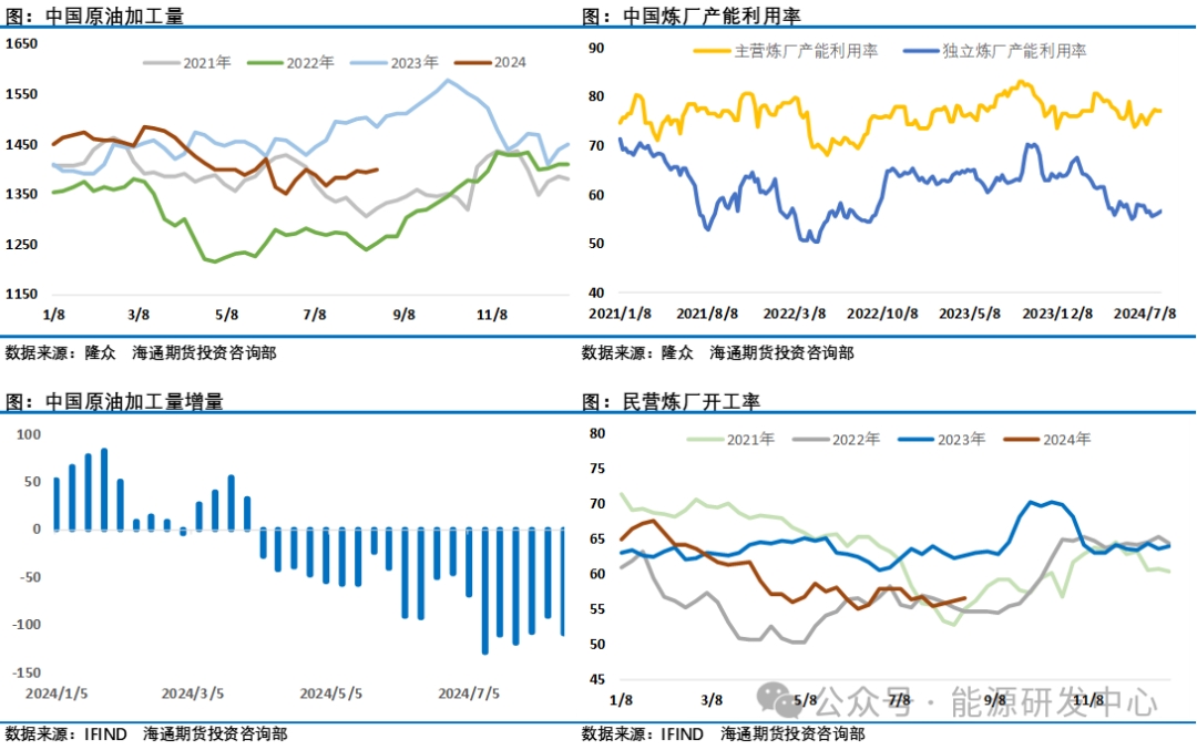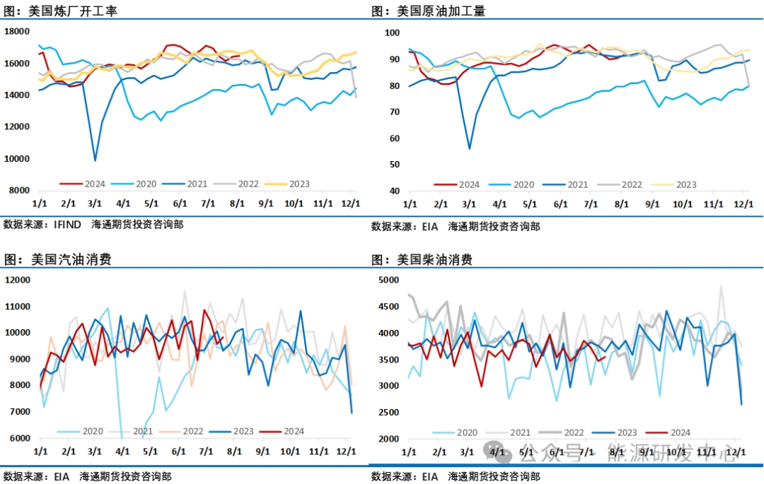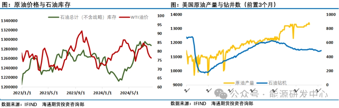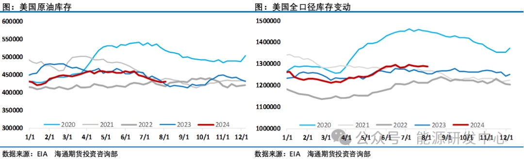 供應(yīng)端IEA月報(bào)顯示由于歐佩克+供應(yīng)顯著增加,全球石油供應(yīng)在7月份上升了23萬桶/日。經(jīng)過四個(gè)月的增加后,6月份全球觀察到的石油庫(kù)存減少了2620萬桶。歐佩克+的減產(chǎn)正在收緊實(shí)物市場(chǎng),目前供應(yīng)難以跟上夏季高峰需求,導(dǎo)致市場(chǎng)出現(xiàn)短缺。俄羅斯7月份石油出口環(huán)比下降28萬桶/日,降至740萬桶/日。預(yù)計(jì)2024年和2025年非歐佩克+國(guó)家的產(chǎn)量增長(zhǎng)為150萬桶/日。而歐佩克在其月度報(bào)告中表示,歐佩克12個(gè)成員國(guó)7月份的石油日產(chǎn)量為2675萬桶,比6月份增加了18.5萬桶,其中沙特、伊拉克和伊朗的產(chǎn)量增加,而利比亞的產(chǎn)量下降。而歐佩克+中的非歐佩克國(guó)家7月份的日產(chǎn)量為1416萬桶,比6月份減少了6.8萬桶,其中俄羅斯、哈薩克斯坦和南蘇丹的日產(chǎn)量均有所下降。具體來看,俄羅斯的石油產(chǎn)量從6月份的911.5萬桶/日下降至7月份的908.9萬桶/日,減少2.6萬桶/日。不過根據(jù)歐佩克+設(shè)定的目標(biāo),俄羅斯7月份的產(chǎn)量本應(yīng)達(dá)到897.8萬桶/日,或減少11.1萬桶/日。俄羅斯能源部上周表示,7月份,“由于供應(yīng)計(jì)劃的一次性問題,俄羅斯7月的日產(chǎn)量比歐佩克+協(xié)議設(shè)定的目標(biāo)高出6.7萬桶,而8月和9月的水平應(yīng)該可以彌補(bǔ)這一點(diǎn)。”此外,數(shù)據(jù)顯示,伊拉克超過目標(biāo)32.1萬桶/日,哈薩克斯坦超過目標(biāo)9.5萬桶/日,歐佩克+超過7月石油目標(biāo)8.4萬桶/日。