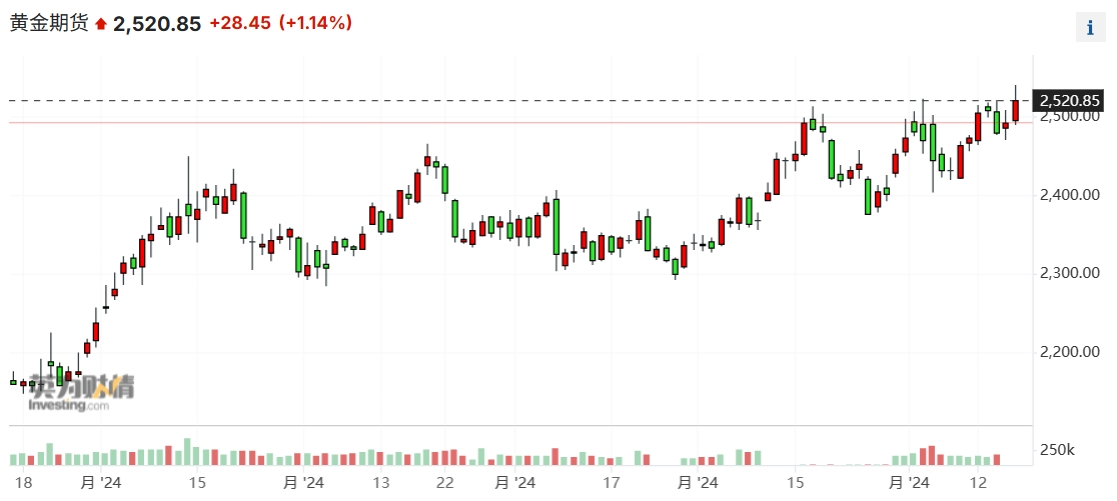 周五美盤(pán)交易時(shí)段,現(xiàn)貨黃金曾短暫突破2500美元關(guān)口,不過(guò)最新漲幅有所收窄;美國(guó)黃金期貨上漲1.1%,至每盎司2520.8美元。