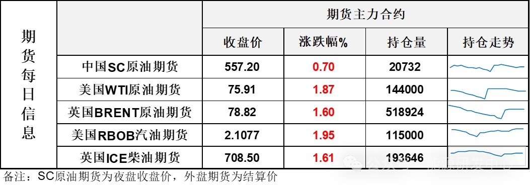 【1】WTI主力原油期貨收漲1.39美元,漲幅1.87%,報75.91美元/桶;布倫特主力原油期貨收漲1.24美元,漲幅1.6%,報78.82美元/桶;INE原油期貨收漲0.7%,報557.2元。