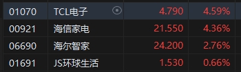 家電股漲幅居前,TCL電子(4.79, 0.21, 4.58%)、海信家電漲超4%。華創(chuàng)證券指出,關稅過度悲觀導致家電出口鏈價值凸顯。該行指出,美國市場難以剝離中國系供給;美國家電產業(yè)微末,本地投產事倍功半;寡頭價值傳遞,對美業(yè)務實際影響有限。此外,新興區(qū)域龐大增量保障成長性,比較各出口產業(yè)家電極具優(yōu)勢。高度關注出口鏈家電頭部企業(yè)。